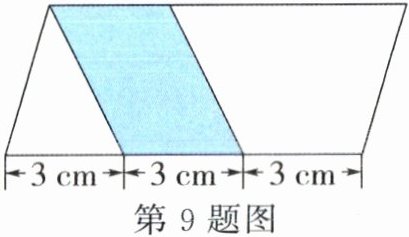 9. 如图,一个大平行四边形被分成了 3 块,已知涂色部分是一个平行四边形,面积是 12 平方厘米,则空白梯形的面积是( )平方厘米。(2 分)