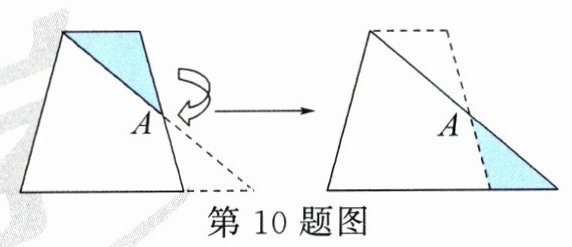 10. 如图,求梯形面积时可以找到一条腰的中点 A,按如图所示的方式连接,然后把上部涂色部分绕中点 A 旋转,把梯形转化成三角形。如果梯形的上底是 4 厘米,下底是 9 厘米,高是 10 厘米,那么转化成的三角形的底是( )厘米,高是( )厘米,面积是( )平方厘米。