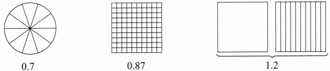 第三个图形:左边一整个正方形表示1,右边一共有10份,表示0.2,涂色2份即可。