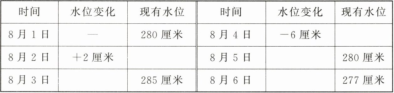 1. 日常生活中,在用正、负数表示水库的水位变化情况时,不是以某一固定的高度(水库水位原有的高度)作为参照,而是以前一天水库的水位情况作为参照。请你根据以上规则,将下面用正、负数表示的记录表补充完整。(5分)