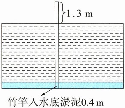 2. 一根长 5.2 米的竹竿垂直插入水池底部,竹竿入水底淤泥的部分是 0.4 米,露出水面的部分是 1.3 米(如图)。池中水深多少米? (4 分)