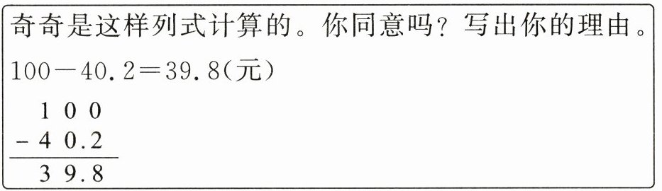 (1)不同意。用竖式计算小数减法时,需要将小数点对齐再算,奇奇在计算时,没有将小数点对齐。正确的算式应该是100-40.2=59.8(元)。