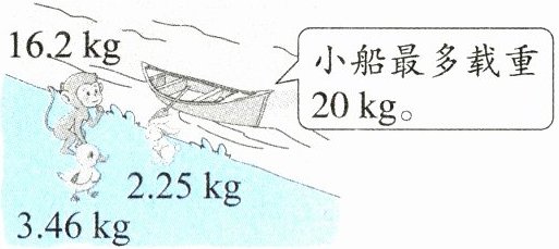 (2)16.2+3.46=19.66(千克) 16.65+2.25=18.9(千克) 小猴和小鸭一批,小兔和小鹿一批。