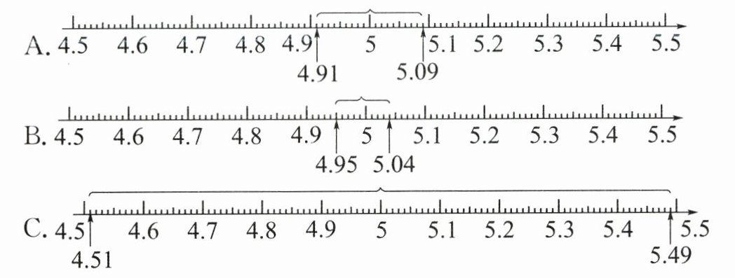 4. 一个两位小数精确到十分位是5.0,下面三幅图中,能正确表示这个两位小数取值范围的是( )。