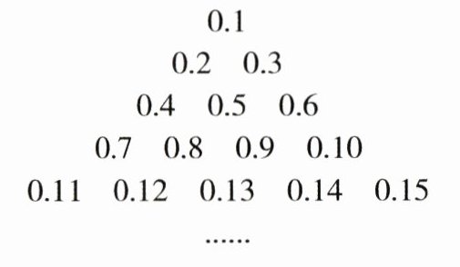 12 9 解析:观察可知,第1行有1个数,第2行有2个数,第3行有3个数……到第11行结束,一共有1 + 2 + 3 + … + 11 = 66(个)数,到第12行结束,一共有1 + 2 + 3 + … + 12 = 78(个)数,因为0.755是第75个数,所以应该在第12行,左起第75 - 66 = 9(个)数。