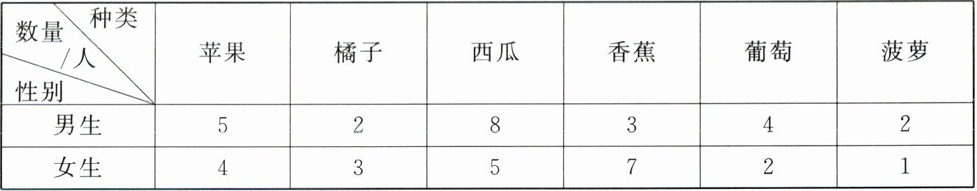 | 数量/人 | 种类 | 苹果 | 橘子 | 西瓜 | 香蕉 | 葡萄 | 菠萝 |