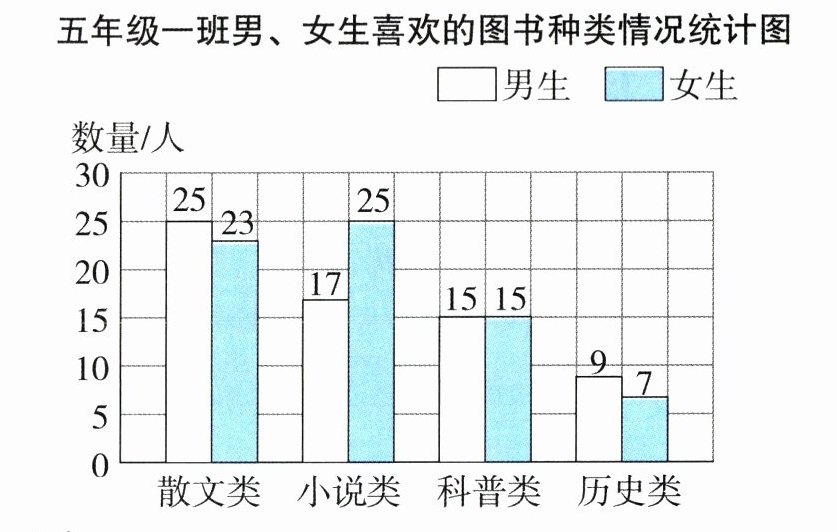 2. 下图是某小学五年级一班男、女生喜欢的图书种类情况。