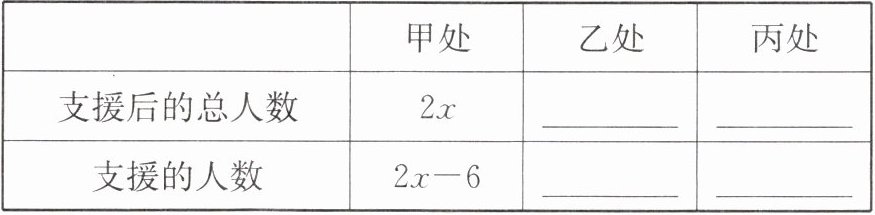 由题意,得 4x - 8 = 2(3x - 10),解得 x = 6,所以 2x - 6 = 6,3x - 10 = 8,4x - 8 = 16.答:支援甲处的有 6 人,支援乙处的有 8 人,支援丙处的有 16 人.