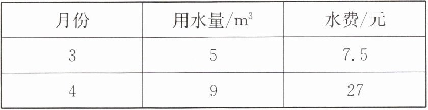 (1)3月份用水5 $m^3$,水费为7.5元,则5a=7.5,解得a=1.5;4月份用水9 $m^3$,水费为27元,则6×1.5+(9-6)b=27,解得b=6,所以当用户用水量为x $m^3$(x>6)时的水费为6×1.5+6(x-6)=(6x-27)元.