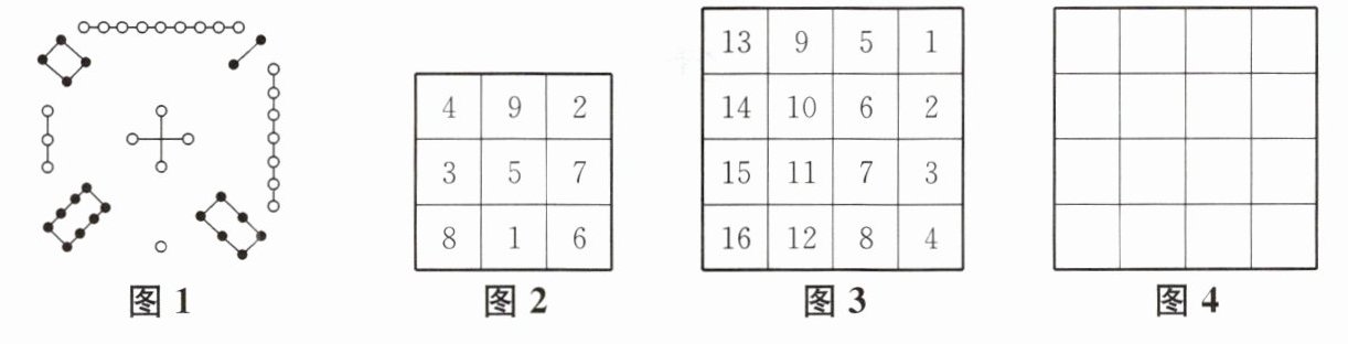 3. 幻方,相传最早见于我国的“洛书”,如图1,洛书中每行、每列以及两条对角线上的点数之和都等于15,是一种3阶幻方(如图2).我国南宋数学家杨辉是从数学角度对幻方进行系统研究的第一人,他在《续古摘奇算法》一书中给出从3阶到10阶的幻方,并对一些低阶幻方介绍了构造方法,其中运用了对称思想.例如,用1、2、3、…、16构造4阶幻方的方法是:先将1、2、3、…、16依次排成图3所示,然后先将外四角对换,即1与16对换,4与13对换,再将内四角对换……请你在图4中填写用这种“对换”方法得出的4阶幻方.