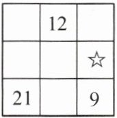 30 解析:如图,设第二行第二个方格中的数为x,“☆”为y.根据题意,得21+9=12+x,21+x=y+9,解得x=18,y=30,即题图所示的幻方中的“☆”处应该填30.