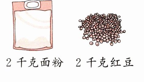 7 妈妈要制作一些红豆馅的糕点,准备了一些材料,如右图。第一次用去了面粉的$\frac {3}{10}$和红豆的$\frac {1}{10}$,第二次用去了$\frac {3}{10}$千克面粉和红豆的$\frac {3}{10}$。