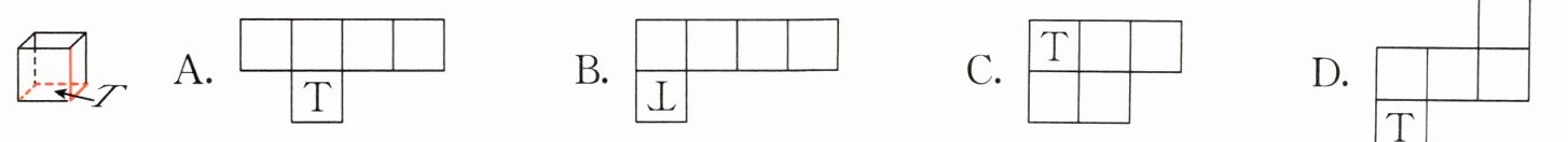 解析 将无盖正方体纸盒沿彩线剪开后,纸盒的右面、后面、左面和前面这4个面并排展开,而带有字母T的下面则和前面共用一条边,形成B选项所示的展开图。