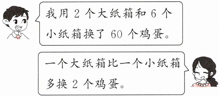 3 近年来不少快递企业为环保助力。阳光快递开展“快递箱换鸡蛋”活动,请你参考下面的对话算一算,每个大纸箱能换多少个鸡蛋? 每个小纸箱呢?