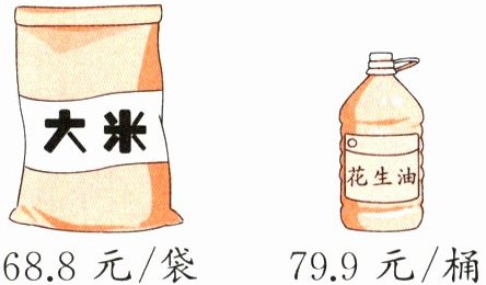 1. 某超市开展促销活动,王阿姨领到了一张满100元减20元的消费券,她准备购买一袋大米和一桶花生油(如下图)。算一算,她实际付了多少元?(4分)