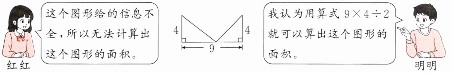 明明:我认为用算式$9×4÷2$就可以算出这个图形的面积。