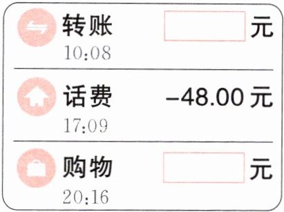 )。(2)豆豆爸爸给豆豆妈妈转账888元,豆豆妈妈购物花去43元,应该如何记录?请你在右图中的方框里填一填。