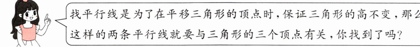 找平行线是为了在平移三角形的顶点时,保证三角形的高不变,那么这样的两条平行线就要与三角形的三个顶点有关,你找到了吗?
