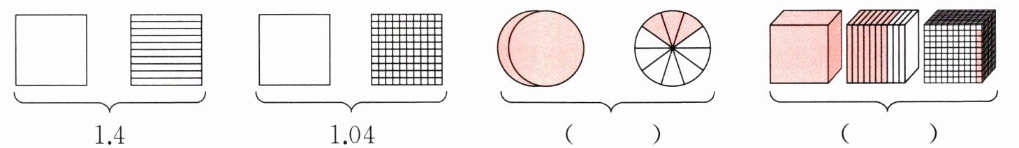 1 涂一涂,写一写。(每个大正方形、圆和大正方体都表示整数“1”)