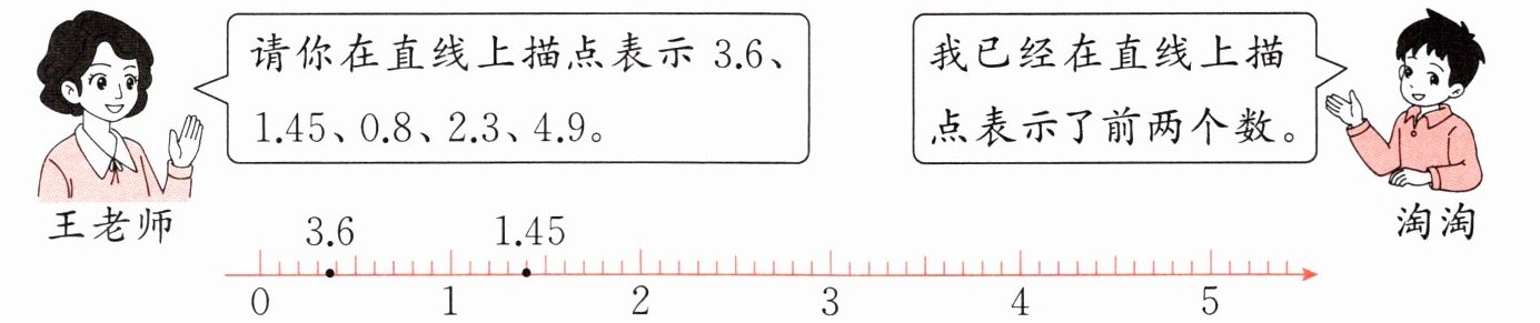 不对 在直线上描点前,先弄清直线上每1小段表示的小数是多少,再确定需描点表示的数在哪两个整数之间(表述合理即可)