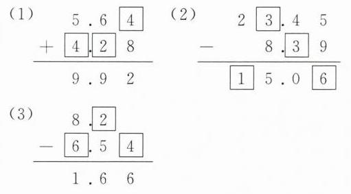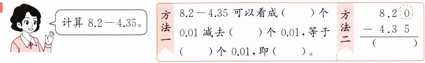 $8.2-4.35$可以看成( )个0.01减去( )个0.01,等于( )个0.01,即( )。