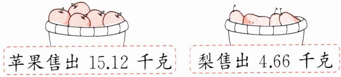15.12 - 4.66=10.46(千克) 10.64>10.46 10.64 - 10.46=0.18(千克)答:苹果更多,多0.18千克。解析 步骤一 苹果比梨多售出10.46千克。步骤二 苹果在原来比梨多10.64千克的基础上,又比梨多售出了10.46千克。10.64>10.46,所以剩下的苹果还比梨多。步骤三 剩下的苹果比梨多0.18千克。