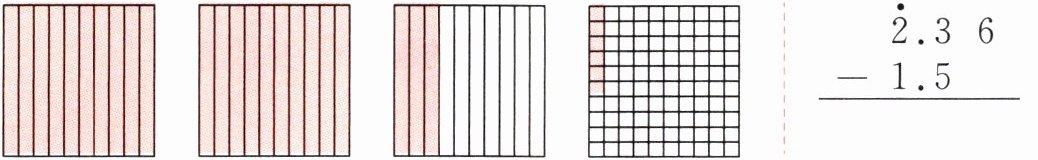 2 在用竖式计算小数加法时,倩倩不明白为什么要“把各数的小数点对齐”。于是同桌阳阳以“$2.36 - 1.5$”为例,利用下面的正方形画一画、涂一涂,帮她理解其中的算理。