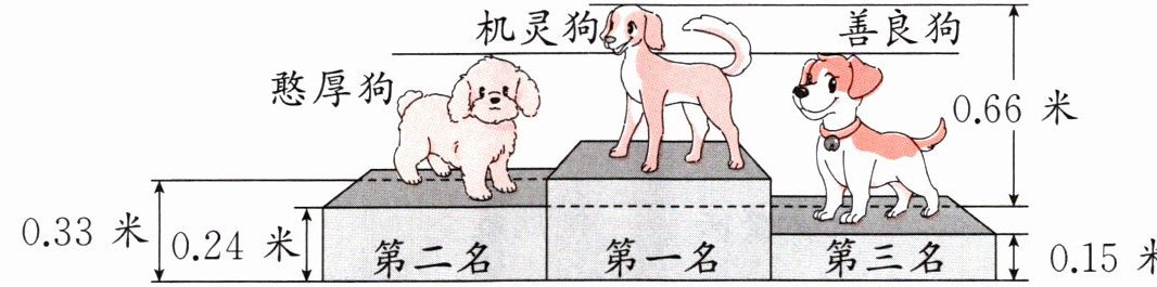 (1)0.24-0.15=0.09(米)0.09米=9厘米答:善良狗比憨厚狗高9厘米。(2)0.24+0.66-0.33=0.57(米)答:机灵狗的身高是0.57米。