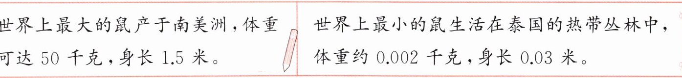 最大鼠的体重大约是最小鼠的几倍 50÷0.002=25000 最大鼠的身长大约是最小鼠的几倍 1.5÷0.03=50