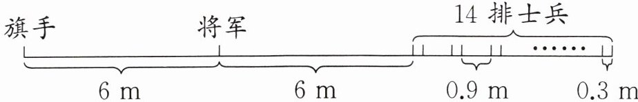 8 在国庆70周年阅兵式中,每个英模部队方队的旗手脚尖到将军脚尖的距离为6米,将军脚尖到第一排士兵脚尖的距离为6米,后面14排里前一排士兵的脚跟到后一排士兵脚尖的距离都是0.9米,每名士兵的脚长都是0.3米(示意图如下)。每个英模部队方队的长度是多少米?