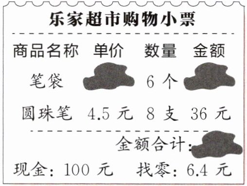 2 联欢会上要举行“优秀学生”颁奖仪式,丁江玲同学购买了6个笔袋和8支圆珠笔。右面是她的购物小票。你能算出一个笔袋多少元吗?