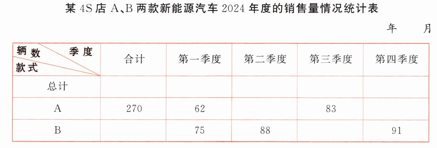 3.自中华人民共和国成立初期“一辆汽车都不能造”的困境起步,中国汽车产业实现跨越式发展,截至 2024 年底已连续 10 年蝉联全球新能源汽车产销量冠军。凭借绿色环保、经济节能、科技领先等核心优势,新能源汽车正重塑全球汽车产业格局,为中国制造注入强劲动力。下面是某 4S 店 A、B 两款新能源汽车 2024 年度的销售量情况。
