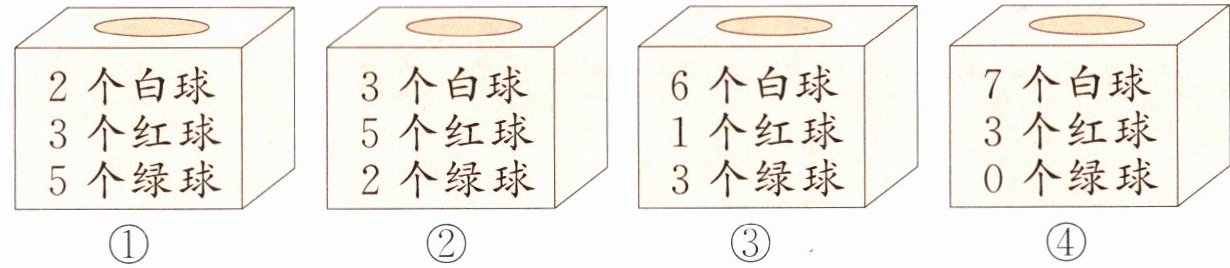3. 三个小朋友玩摸球游戏,每次任意摸出1个,然后放回摇匀。一共有4个箱子,他们选择了其中的一个箱子摸。(球除颜色外完全相同)