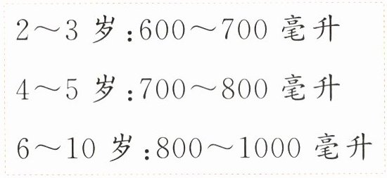 2. 下面是不同年龄儿童每天对水的需求量。8岁的壮壮用容量是300毫升的水杯喝水,若他每天喝3杯半水,则达到他每天对水的需求量了吗?(5分)