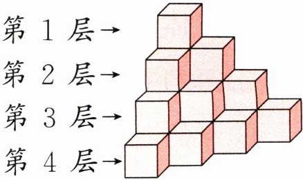 6 10 55 解析 仔细观察物体,可以发现每一层正方体的个数如下表: 第1层 1个 第2层 (1+2)个 第3层 (1+2+3)个 第4层 (1+2+3+4)个 …… 第10层 (1+2+3+4+…+10)个 由此可得出,第3层有1+2+3=6(个)正方体,第4层有1+2+3+4=10(个)正方体,第10层有1+2+3+4+5+6+7+8+9+10=55(个)正方体。