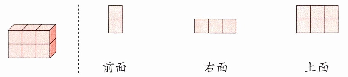 3 用8个同样大的正方体摆一个长方体,使它从前面、右面和上面看到的图形都不相同。请你分别画出从前面、右面和上面看到的图形。