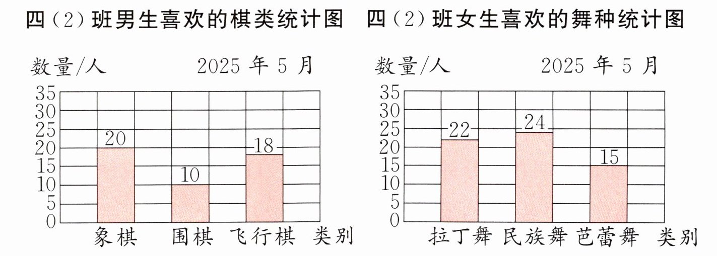 4 小丽调查了四(2)班男生喜欢的棋类和女生喜欢的舞种,结果如下图所示。