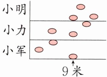 (1)小明、小力和小军进行投沙包比赛,每人投3次,结果如右图所示。他们中,投沙包的平均成绩大约为9米的是(