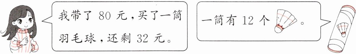 32÷[(80-32)÷12]=8(个) 答:剩下的钱能买8个羽毛球。