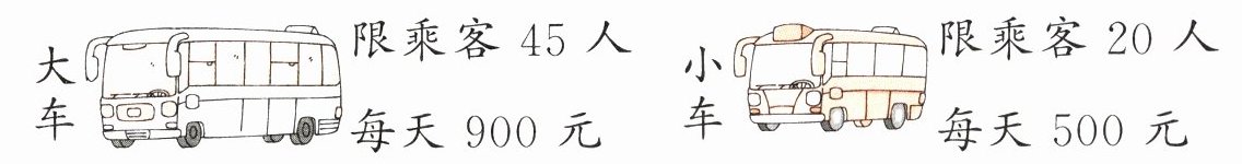 (2)900÷45=20(元) 500÷20=25(元) 20<25 515÷45=11(辆)……20(人) 20÷20=1(辆) 租11辆大车和1辆小车。11×900=9900(元) 9900+1×500=10400(元) 答:租11辆大车和1辆小车租金最少,最少需要10400元。