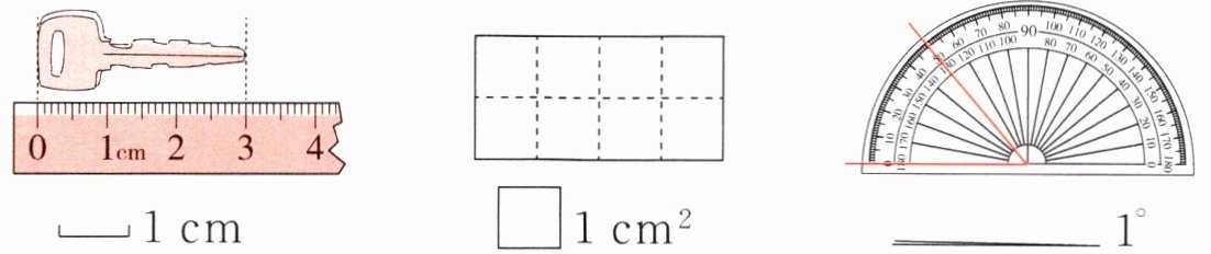 答:它们度量的道理相同。题图中测量长度时,以1厘米为长度单位,测量出有3个1厘米,长度就是3厘米;测量面积时,以1平方厘米为面积单位,测量出有8个1平方厘米,面积就是8平方厘米;度量角时,以1°为度量角的单位,度量出有50个1°,这个角就是50°。都是度量单位的累加。(理由合理即可)