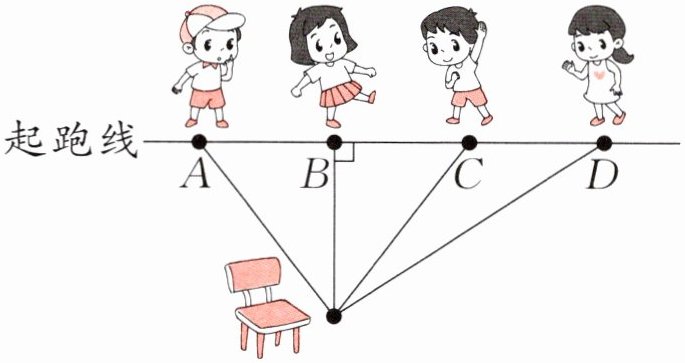 答:站在点B处的同学最有优势。因为在所有从直线外一点向已知直线画出的线段中,与已知直线垂直的线段最短。即点B到凳子的距离是最短的,抢到凳子的可能性最大。