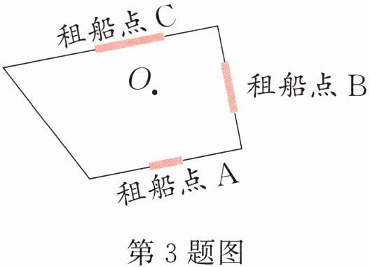 3 爸爸带小明到公园的人工湖划船,当划到点O时发现快到还船时间了,他们想要尽快赶往最近的租船点,请你帮他们设计一条最短的路线,在图中画出来。