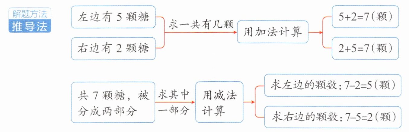 $2 + 5 = 7(颗)$;$7 - 5 = 2(颗)$
