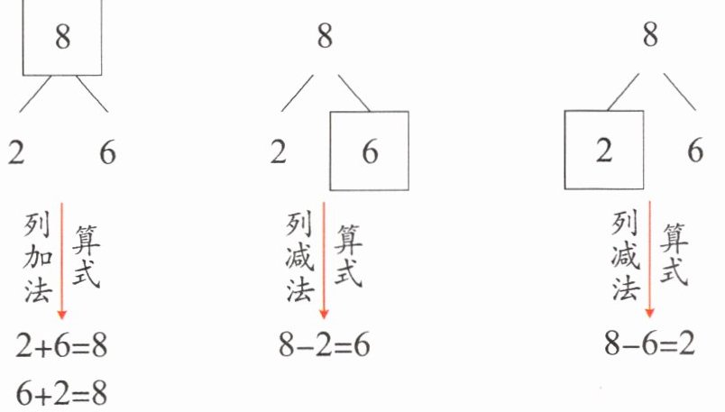 $2 + 6 = 8$,$6 + 2 = 8$,$8 - 2 = 6$,$8 - 6 = 2$;