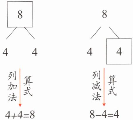 $4 + 4 = 8$,$8 - 4 = 4$。