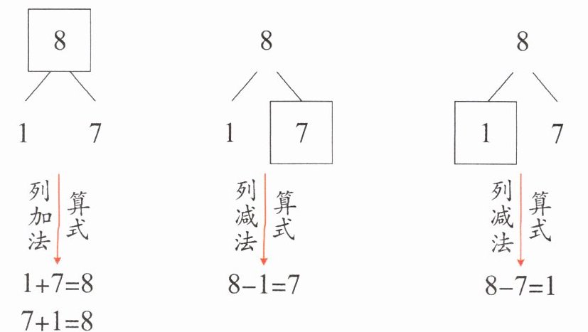 $1 + 7 = 8$,$7 + 1 = 8$,$8 - 1 = 7$,$8 - 7 = 1$;