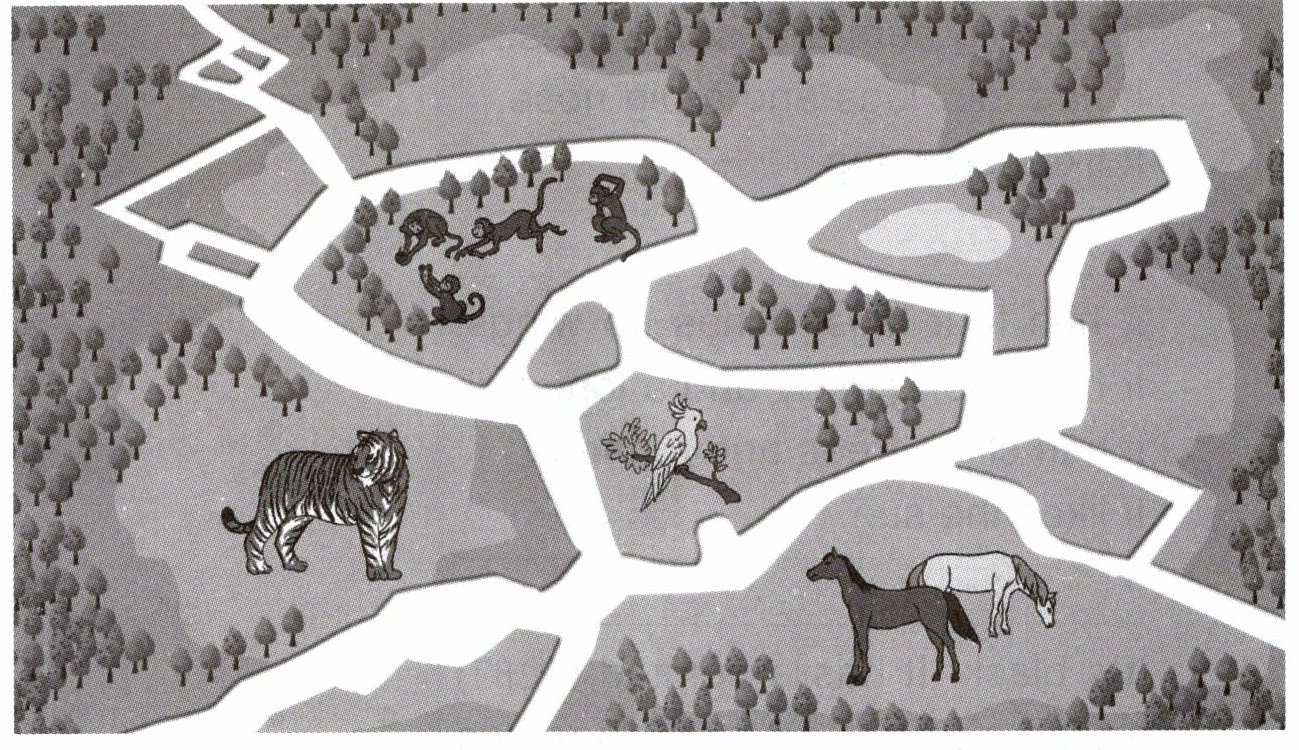 Welcome to City Zoo. I'm your guide. There are many animals here. The monkeys are thin and brown. They have long arms and long legs. They can climb. Look at this tiger. It's orange and black. It has a big body. It can see at night. These two horses are new to the zoo. One is brown and the other is white. They have long legs. They can run fast. Now let's see the parrot. It's white. It has big wings. It can fly. Wow! It says "hello". It can talk.