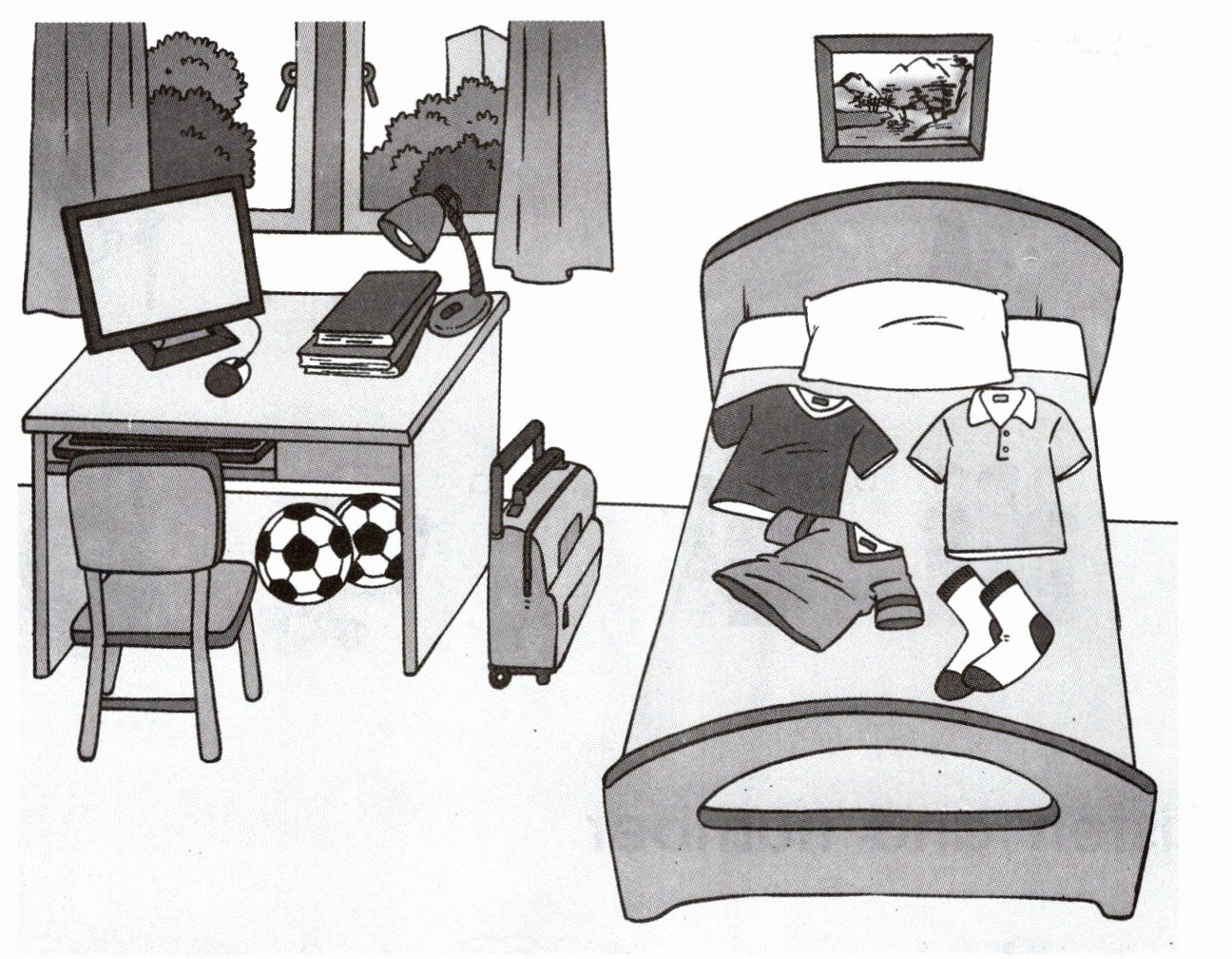 Hello, I'm Tom. This is my bedroom. There is a computer in my bedroom. There are two footballs under the desk. There are some books on the desk. There are some clothes on the bed. There is a schoolbag beside the bed. There is a chair in front of the desk. There is a picture above the bed.