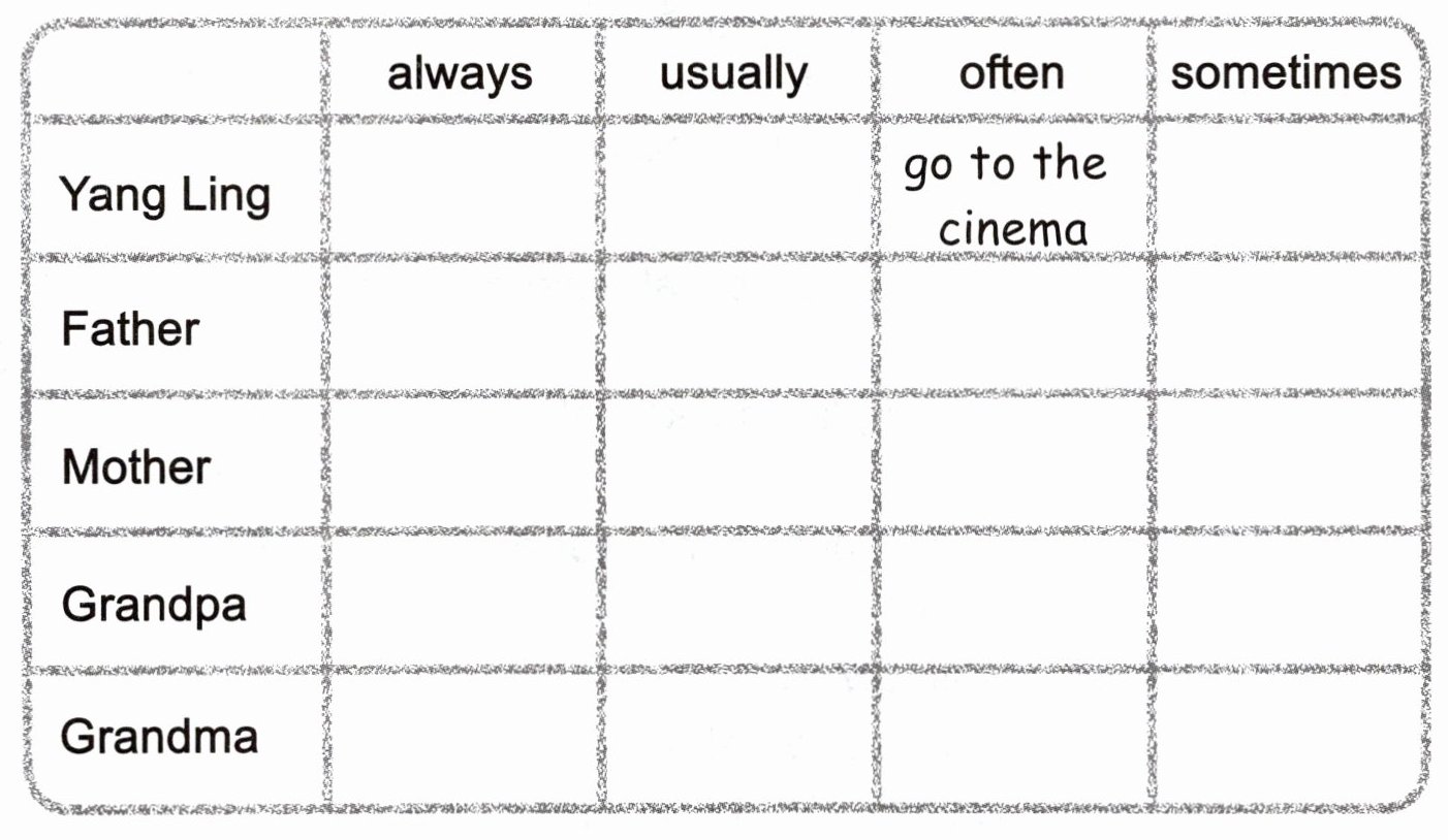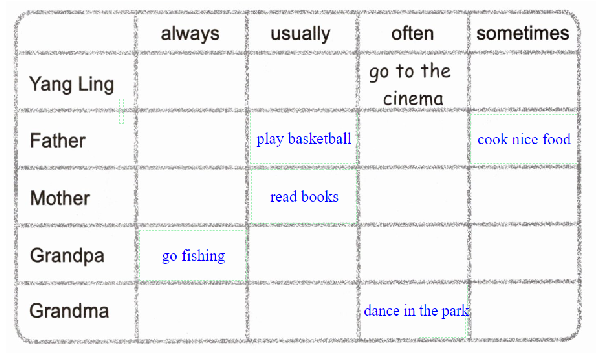 Look at this photo. They are my grandparents, my parents and me. At weekends, my grandpa always goes fishing with his friends. My grandma likes dancing. She often goes to the park and dances there. My father likes sport. He usually plays basketball with his friends on Saturday. He is a good cook. He sometimes cooks nice food on Sunday. My mother likes reading. She usually reads books at home at weekends. I often go to the cinema with my friends on Saturday.